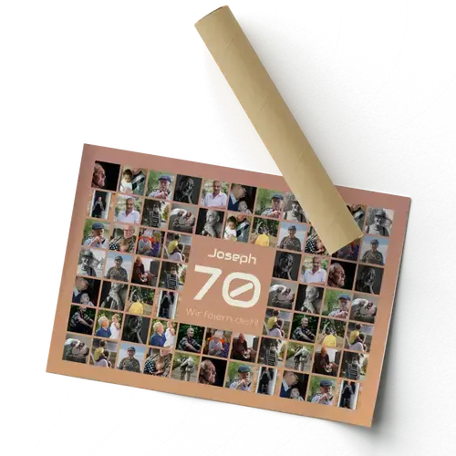 Zahl-Collage 70 – mit Name, Gruß & 20–80 Fotos im Raster. Für 70. Geburtstag oder Firmenjubiläum.