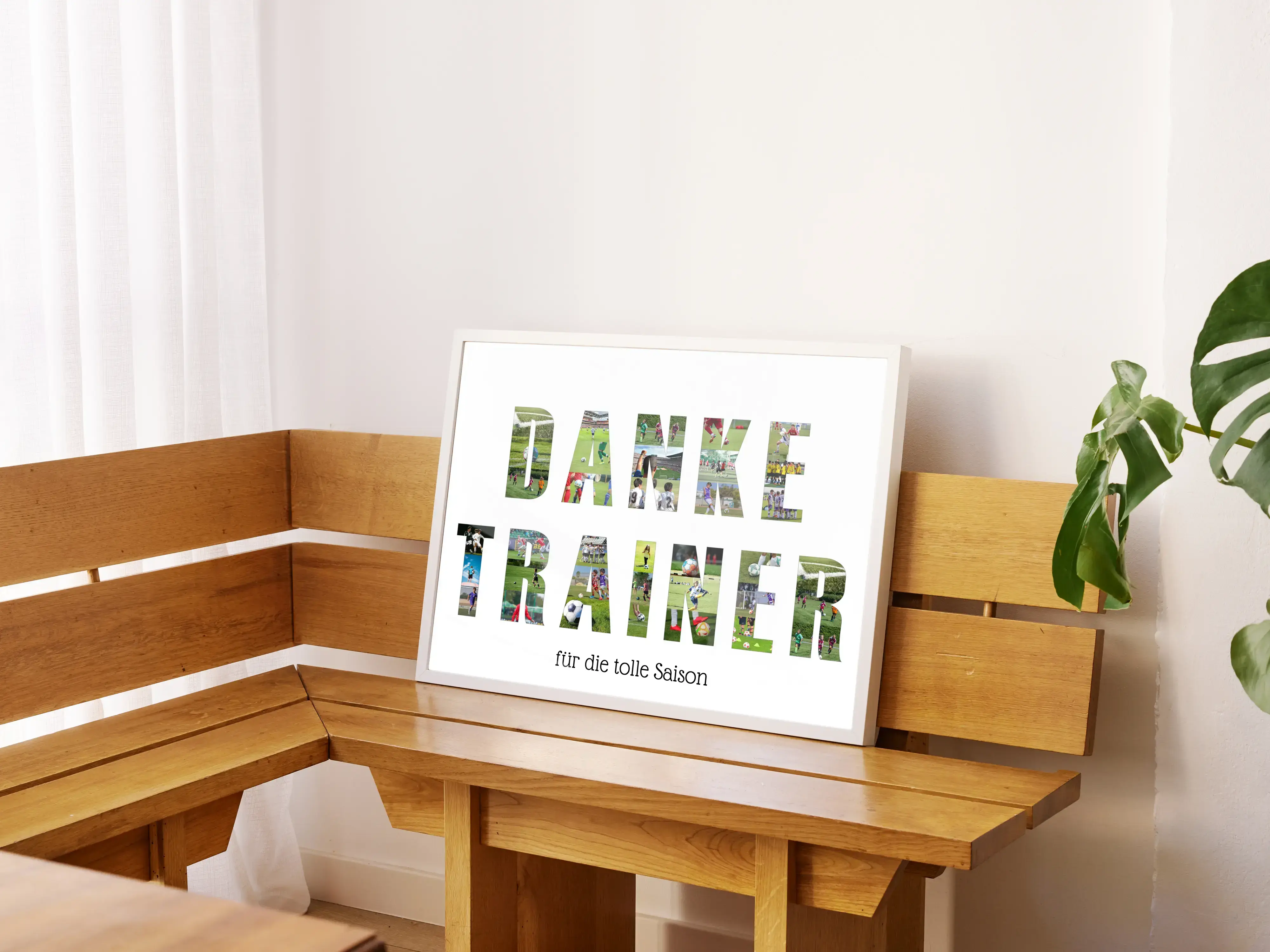Gestalte jetzt Deine eigene personalisierte Fotocollage und zeige Deinem Trainer, wie sehr Du seine Arbeit schätzt. Mit unserer einzigartigen Collage, die die Worte "DANKE TRAINER" aus Fotos bildet, kannst Du wundervolle Momente der letzten Saison festhalten. Eine individuelle Widmung, wie "...für die tolle Saison", verleiht dem Geschenk eine besondere Note. Die Fotos können von Trainingseinheiten oder Spielen stammen und die Teilnehmer bei ihrer Leidenschaft im Einsatz zeigen.