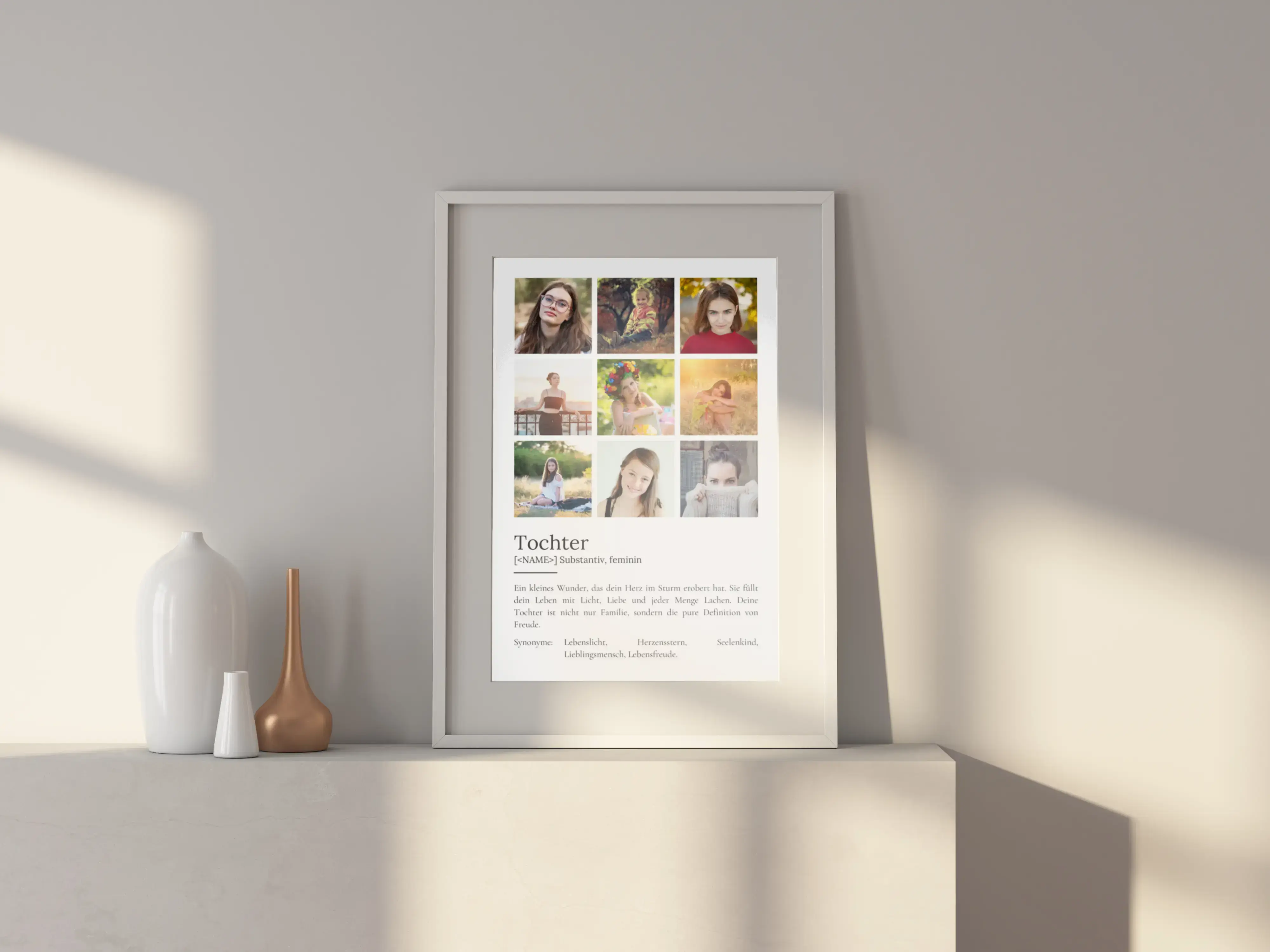 Das personalisierte Definitionsposter "Tochter" bietet Dir eine liebevolle Möglichkeit, Deine Zuneigung und Wertschätzung auszudrücken. Lade einfach ein Foto hoch und ergänze es mit unserem sorgfältig erstellten Definitions-Text: "Ein kleines Wunder, das dein Herz im Sturm erobert hat. Sie füllt dein Leben mit Licht, Liebe und jeder Menge Lachen. Deine Tochter ist nicht nur Familie, sondern die pure Definition von Freude." Du kannst diesen Text nach Belieben anpassen, um Deine persönlichen Gefühle widerzuspiegeln.