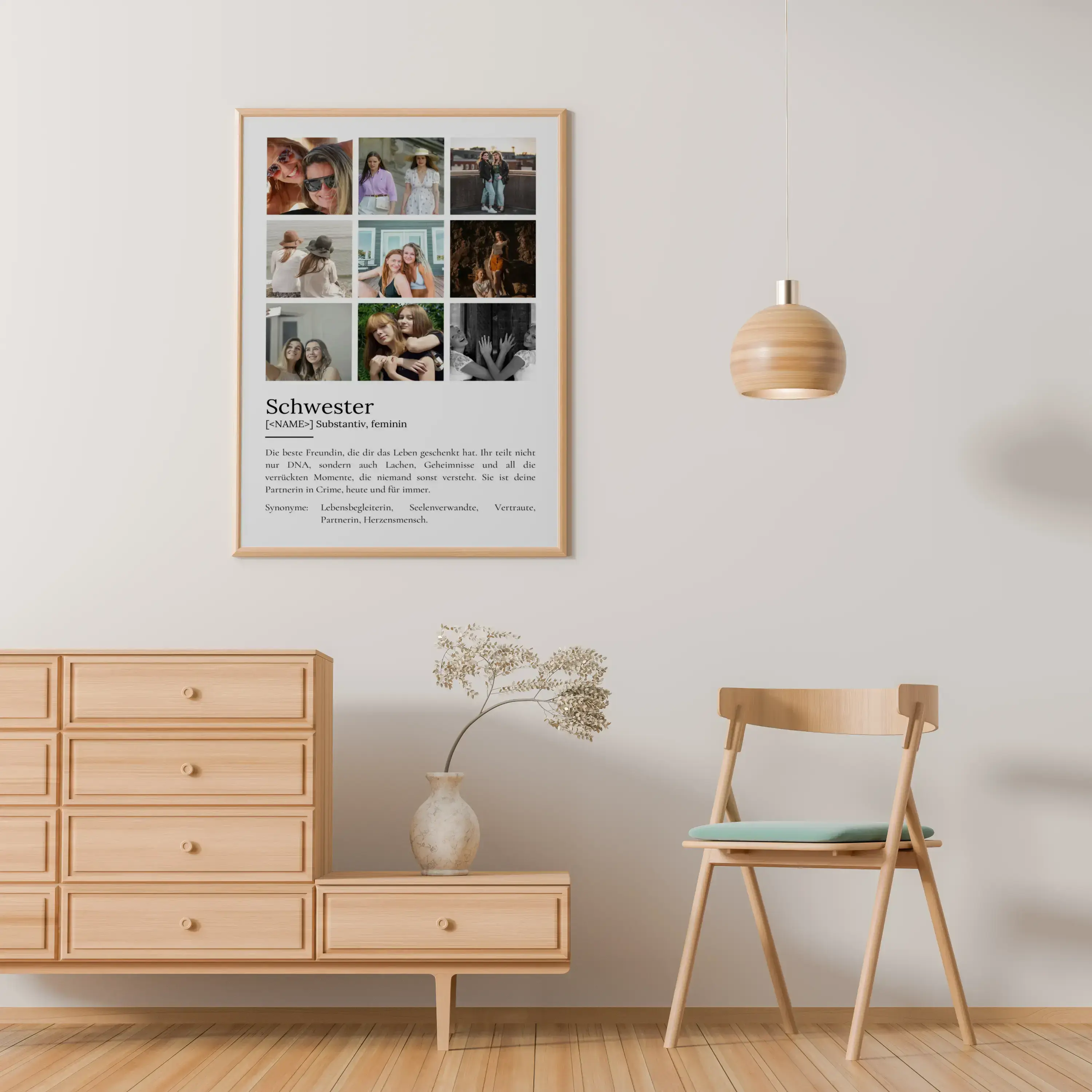 Das personalisierte Definitionsposter für deine Schwester funktioniert ganz einfach. Wähle aus, ob du ein quadratisches, rundes oder sogar mehrere Fotos auf deinem Poster haben möchtest. Lade dein Lieblingsfoto hoch, füge den Namen deiner Schwester hinzu und passe den Definitionstext an oder nutze unseren vorgeschlagenen Text: "Die beste Freundin, die dir das Leben geschenkt hat. Ihr teilt nicht nur DNA, sondern auch Lachen, Geheimnisse und all die verrückten Momente, die niemand sonst versteht. Sie ist deine Partnerin in Crime, heute und für immer."
