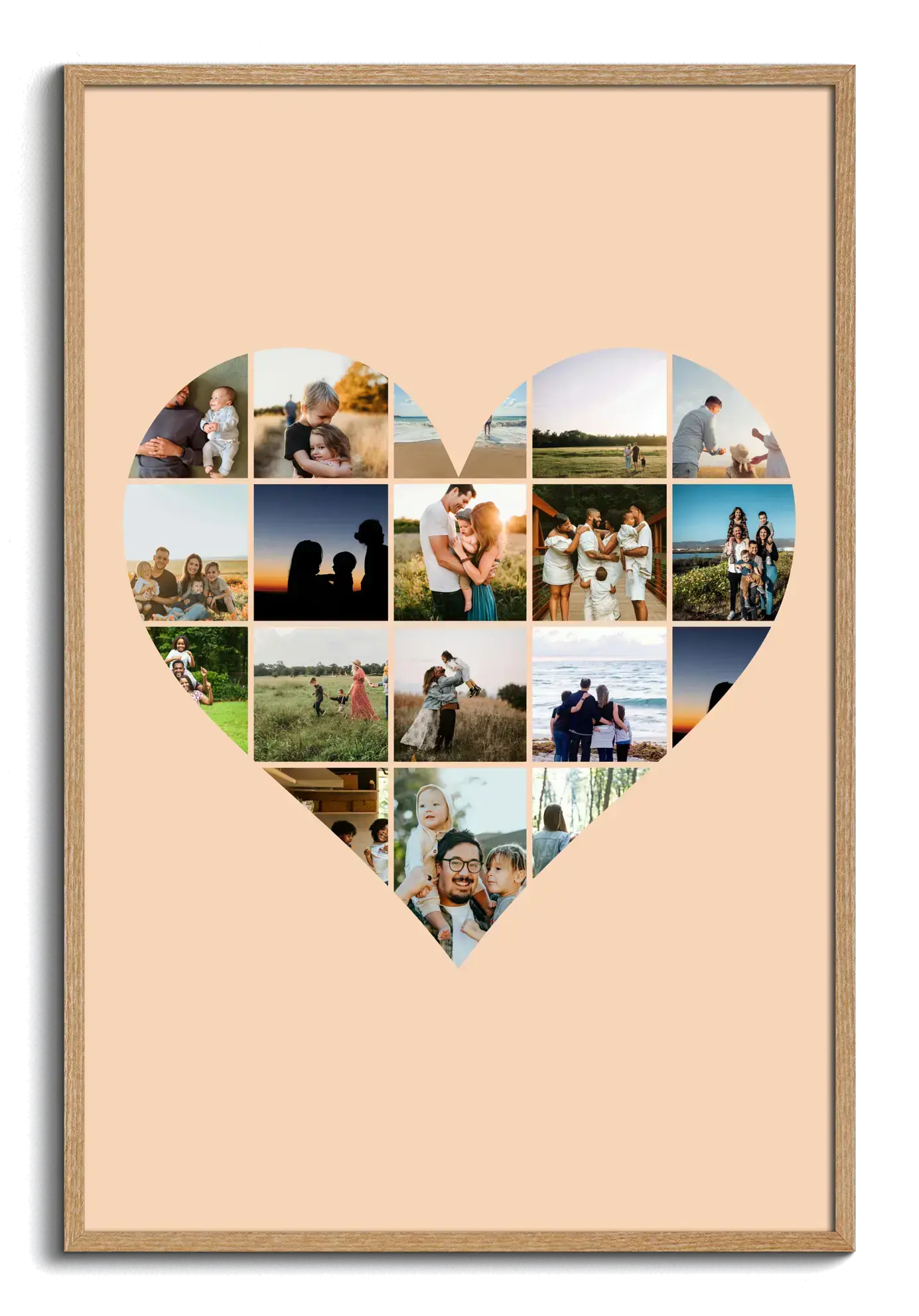 Leg gleich los und gestalte deine persönliche Collage. Perfekt für Familienmomente: Lade Fotos von deiner Familie hoch und arrangiere sie in liebevoll gestalteten Vorlagen – vom Raster bis zum Herz. Füge deinen Wunschtext hinzu, zum Beispiel Family Happiness, und passe Farben und Größen an.