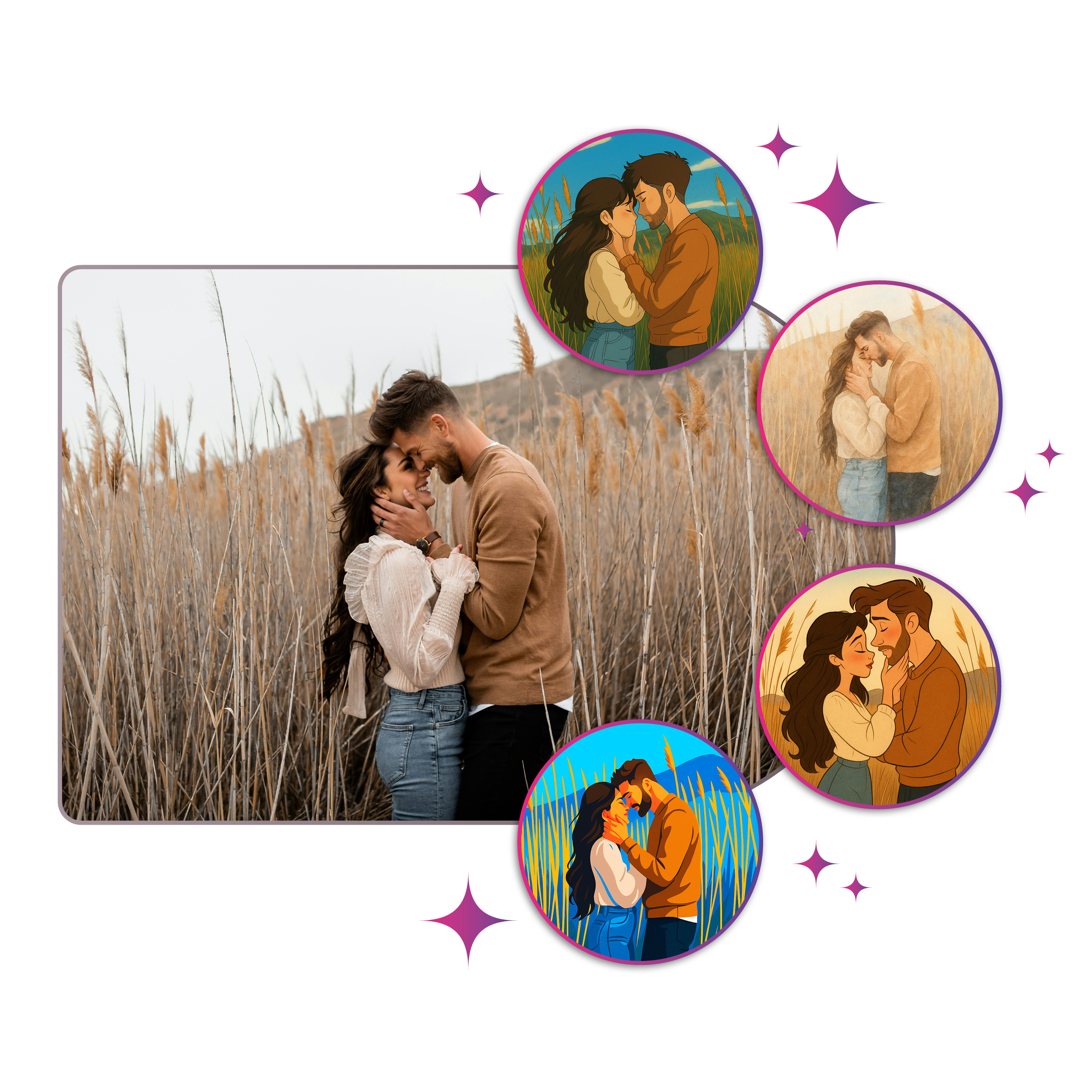 Wähle aus verschiedenen KI-Stilen – von Anime bis Aquarell. Die Beispiele zeigen dir, wie dein Bild im jeweiligen Stil aussehen kann.