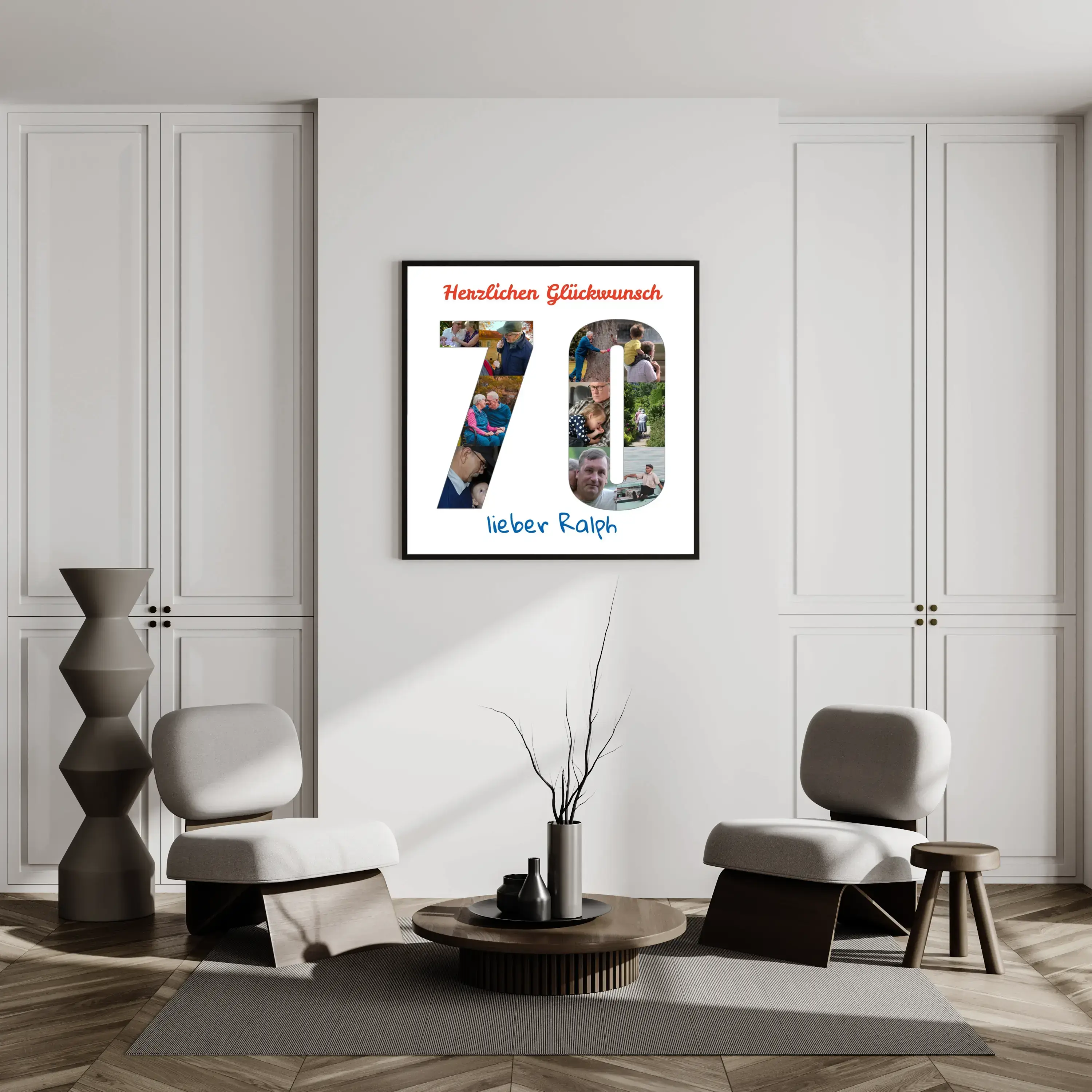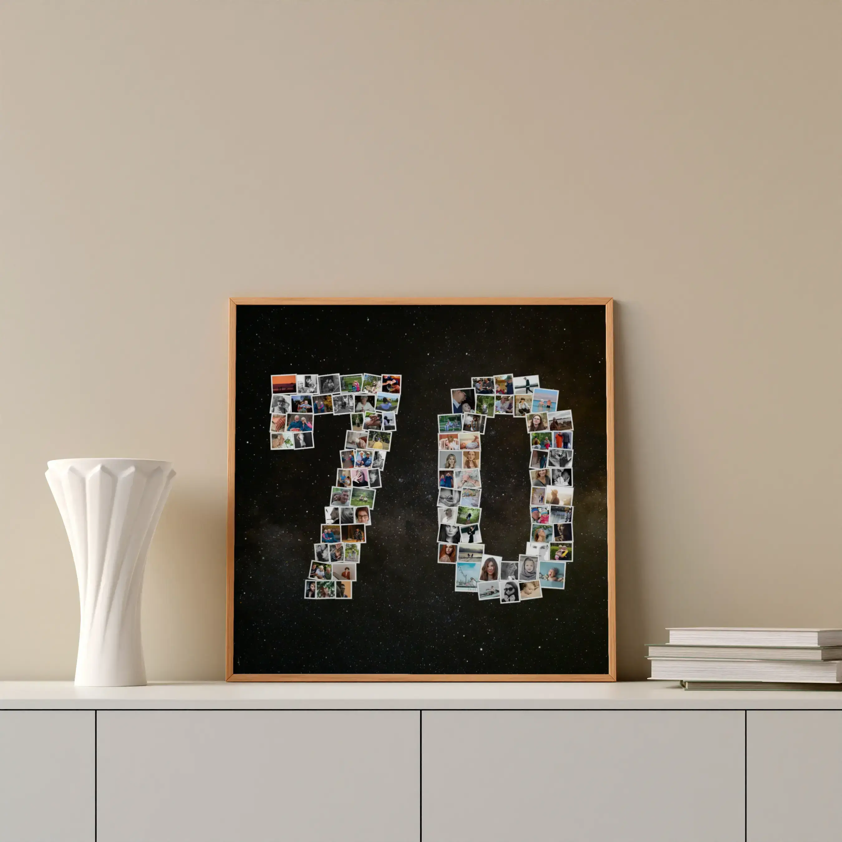 Fotocollage "70" erstellen. Gestalte jetzt dein individuelles Geburtstagsgeschenk mit bis zu 100 Fotos!