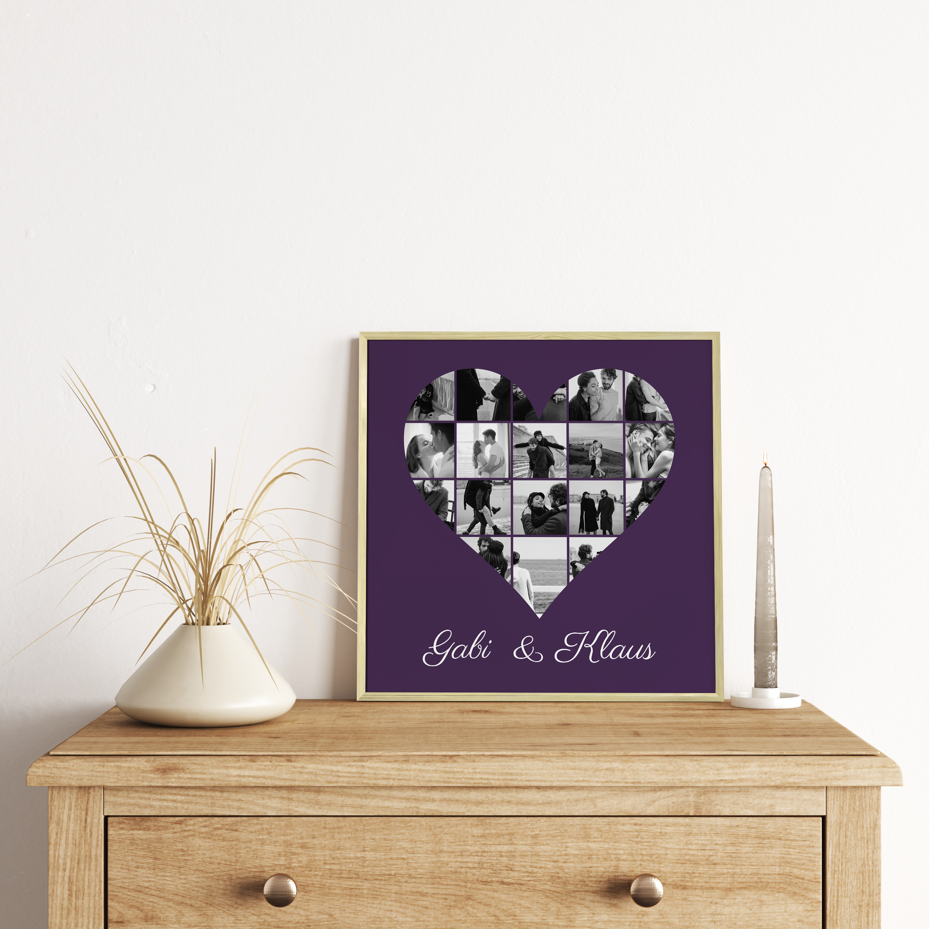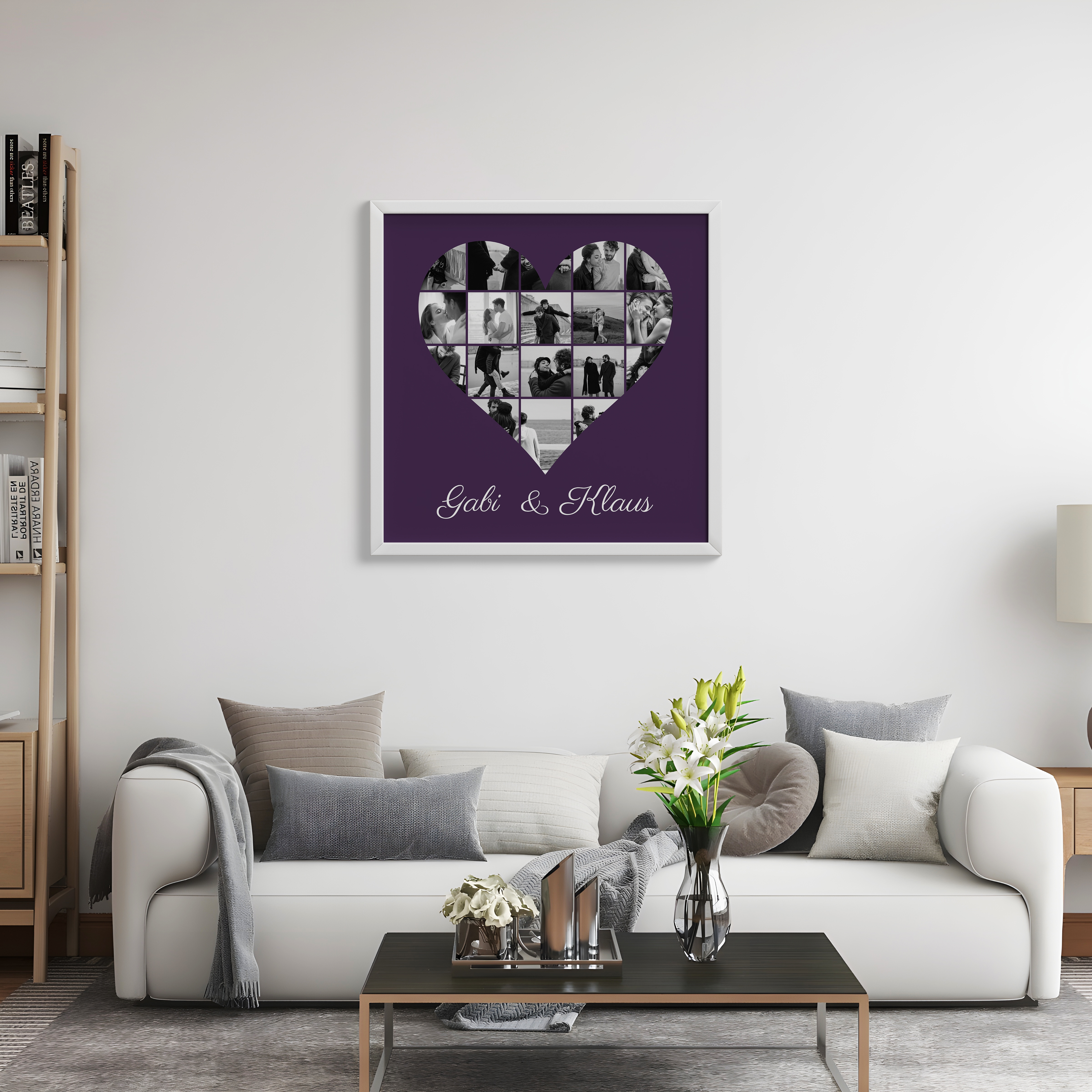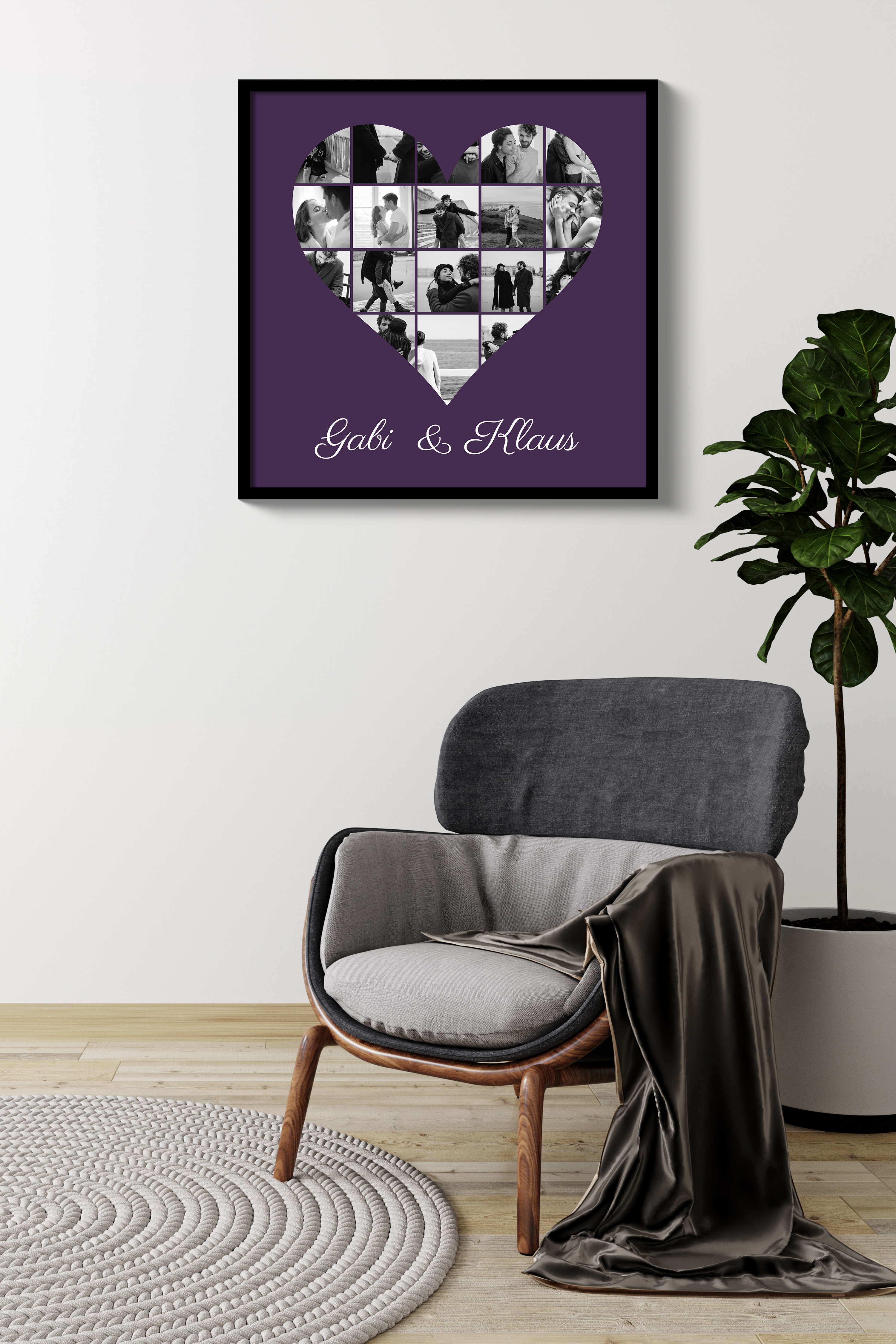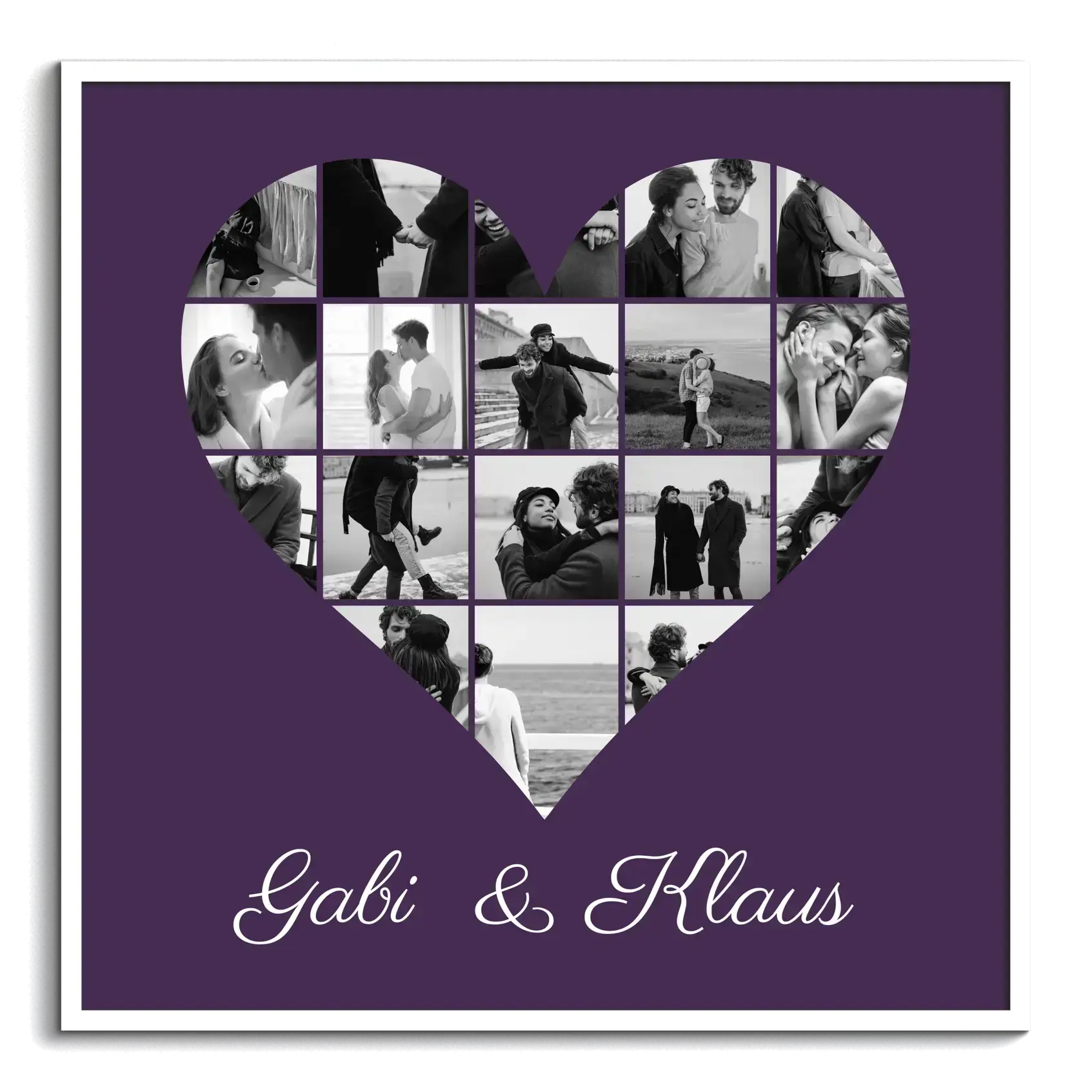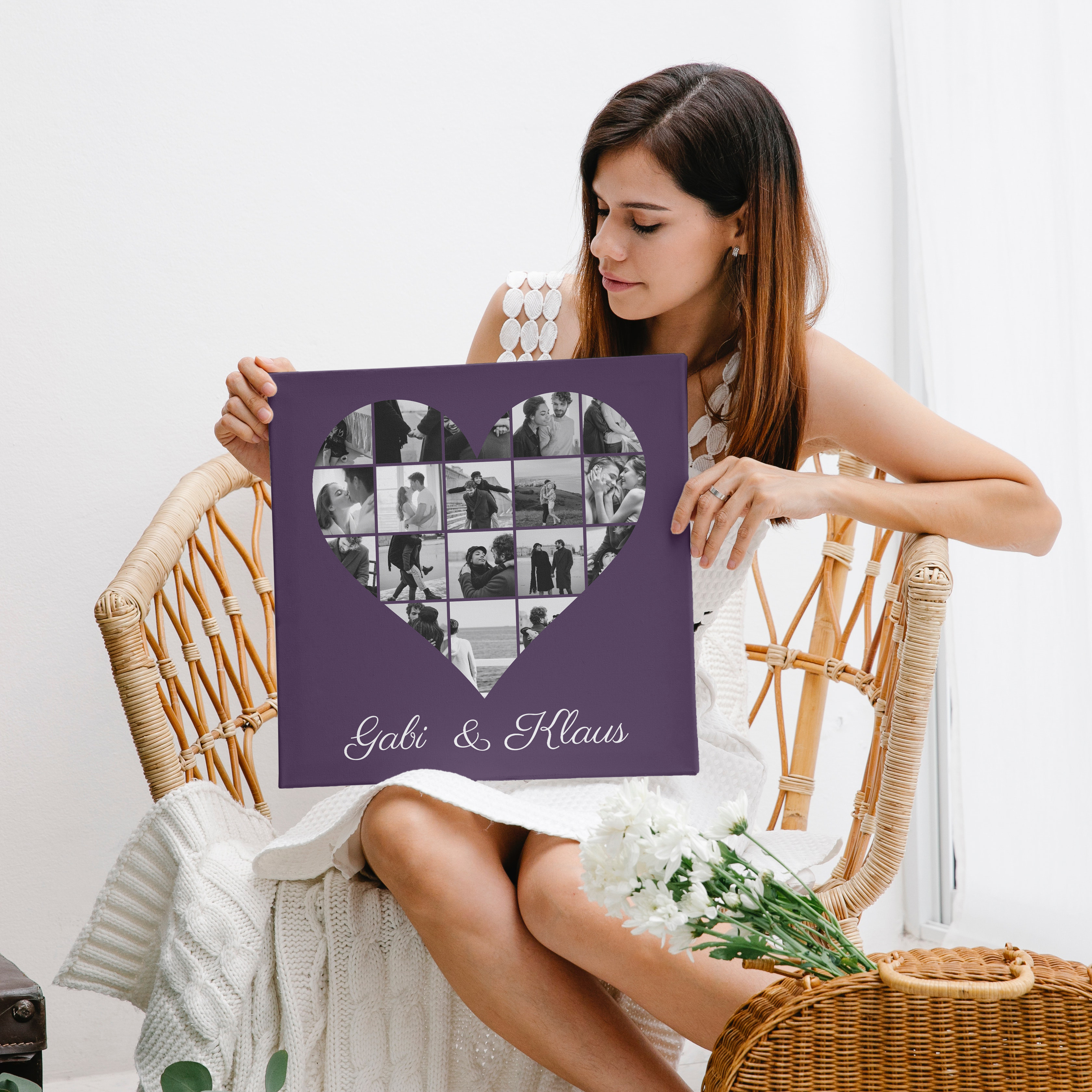 Gestalte jetzt deine individuelle Fotocollage in Herzform auf Leinwand! Verwandle bis zu 42 deiner schönsten gemeinsamen Bilder in eine liebevoll gestaltete Herzcollage. Mit unseren hochwertigen Farbdrucken auf Leinenmaterial hältst du einzigartige Momente in einer Herzcollage fest.