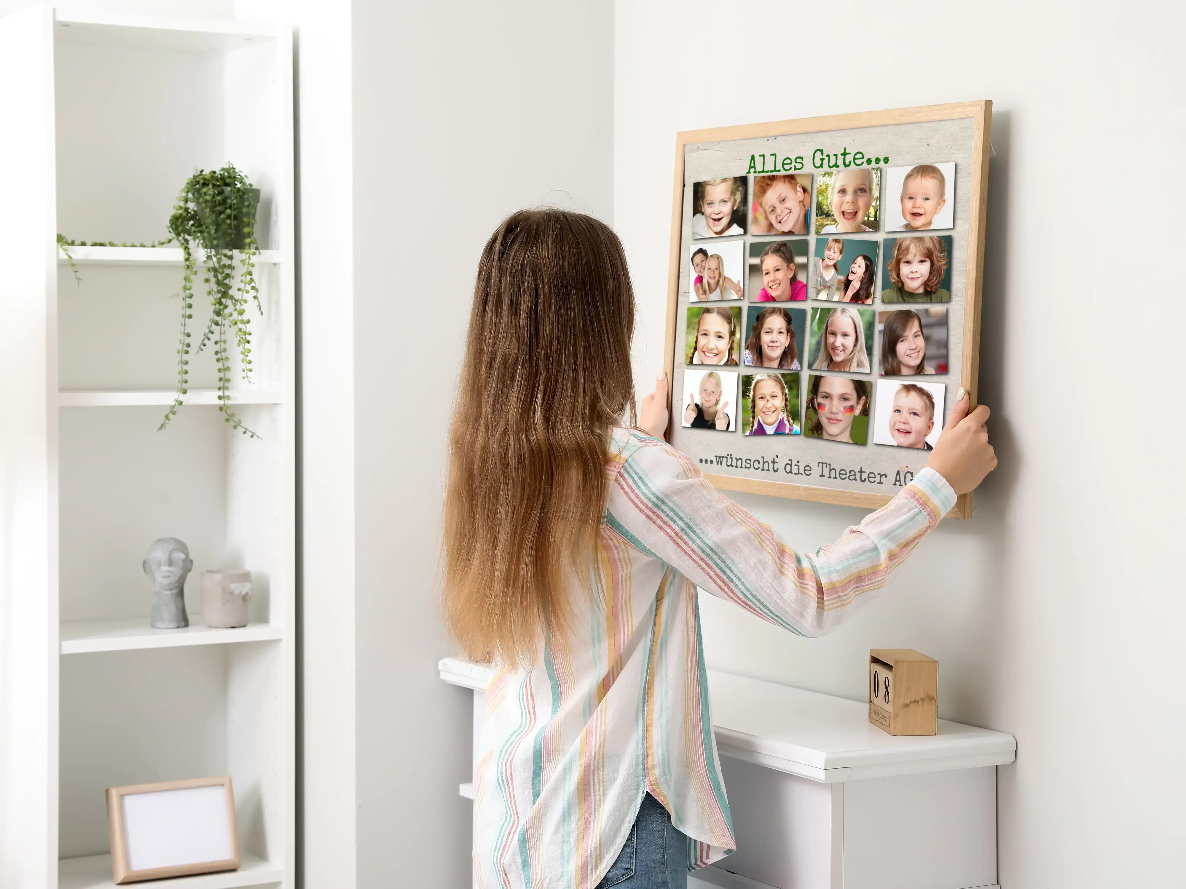 Erwecke deine schönsten Erinnerungen zum Leben und gestalte eine einzigartige Fotocollage deiner Wahl. Ob als persönliches Geschenk oder zur dekorativen Wandverschönerung – du entscheidest, wie deine Erinnerungen präsentiert werden. In unserem Beispiel siehst du eine Fotocollage für die Schule, perfekt als Geschenk oder Erinnerung: 16 Fotos der Kinder sind im Raster angeordnet, begleitet von einem herzlichen Spruch von der Theater-AG. Jede Komponente, sei es Foto, Farbe, Spruch oder Layout, ist individuell anpassbar, um das perfekte Andenken für Kinder, Eltern und Lehrkräfte zu schaffen.