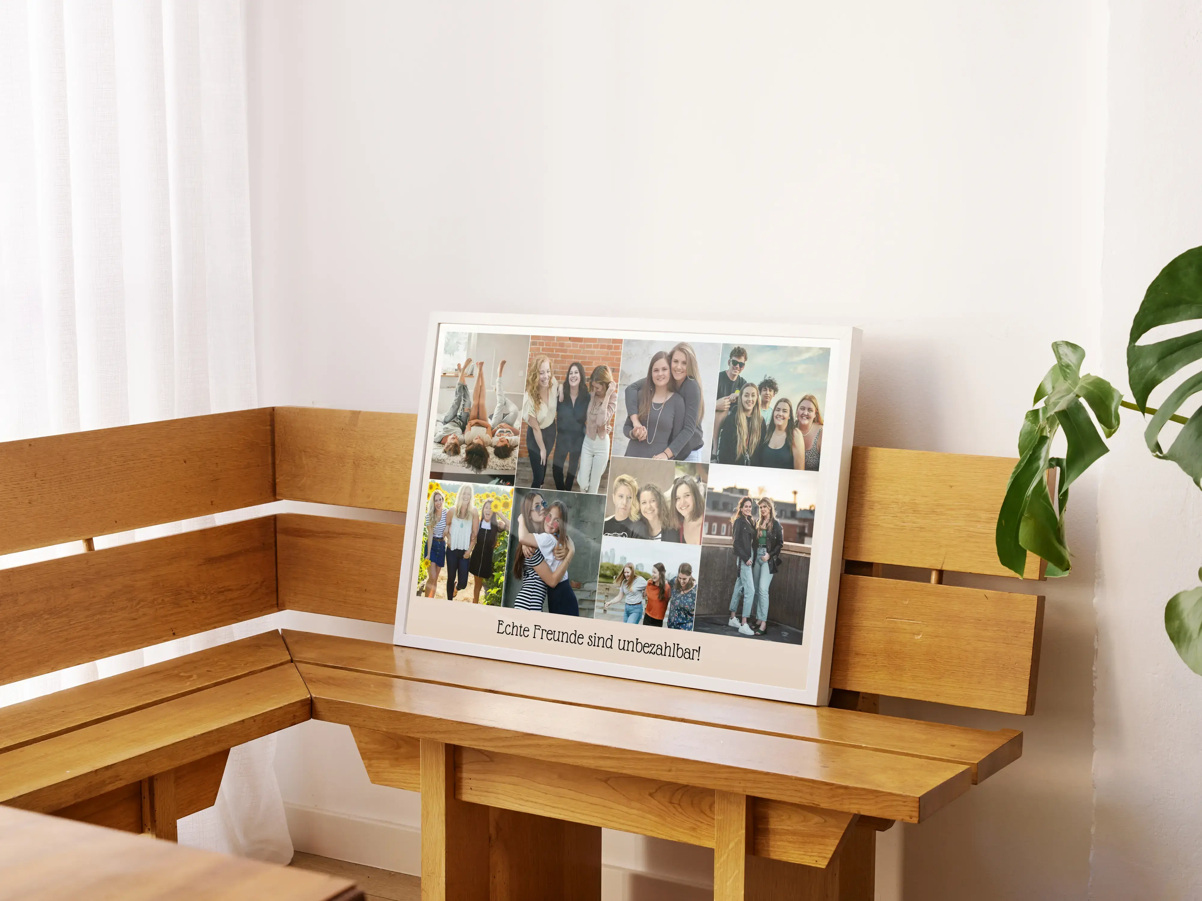 Bei uns stehen dir hochwertige Materialien zur Auswahl, die den persönlichen Wert deiner Collage unterstreichen. Entscheide dich zwischen einem Poster, einem gerahmten Bild, einer Leinwand, Acryl oder Alu-Dibond. Du kannst die Collage sogar als hochauflösende Datei herunterladen, um sie selbst zu drucken oder digital zu teilen.