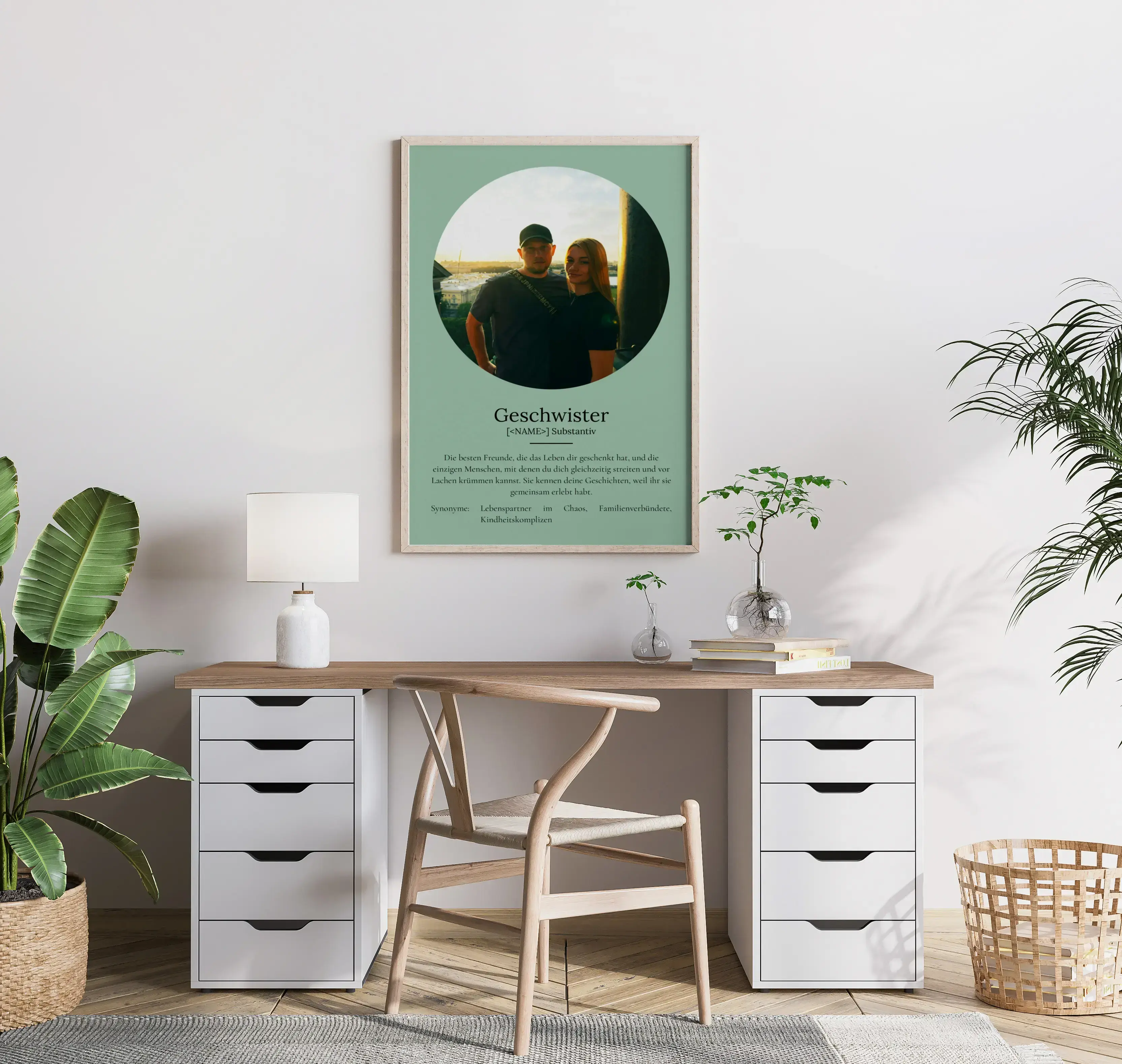 Definitionsposter Geschwister: Persönliches Geschenk, Platz für Foto und individuellen Text im Duden-Stil.