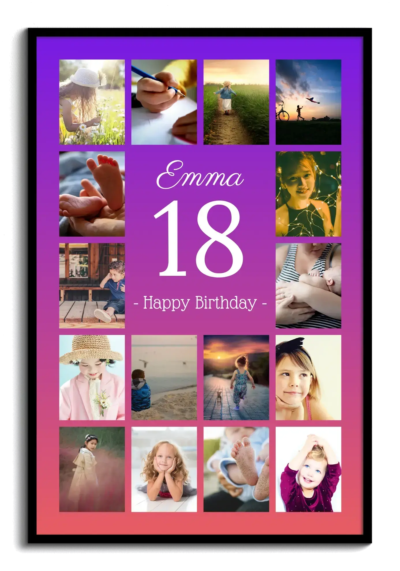 Jetzt gestalten: deine Jubiläums-Zahl Collage 18. Eine große 18 steht im Mittelpunkt, darüber dein Wunschname und darunter ein persönlicher Gruß. Umrahmt von 20–80 Fotos im klaren Raster. Zahl, Name, Text, Bildanzahl, Hintergrund, Farben sowie Hoch- oder Querformat sind frei wählbar – ein starkes Geschenk zum 18. Geburtstag.
