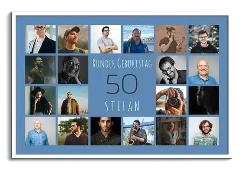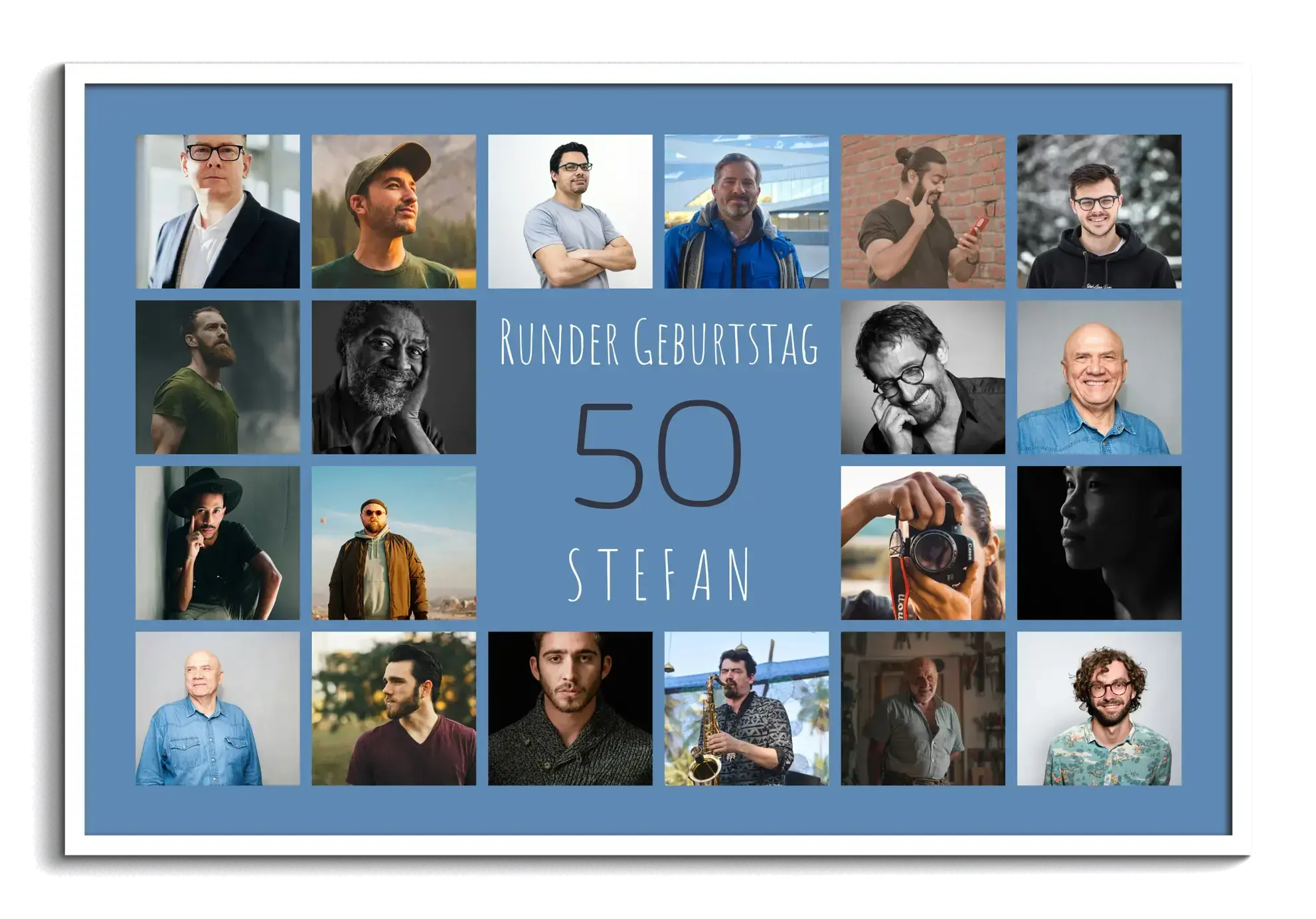 Gestalte jetzt deine Jubiläums-Zahl Collage 50. Im Mittelpunkt steht eine große 50, oben platzierst du den Namen, unten einen kurzen Gruß. 20–80 deiner Fotos rahmen die Zahl in einem klaren Raster ein. Zahl, Name, Farben, Hintergrund sowie Hoch- oder Querformat lassen sich frei anpassen.
