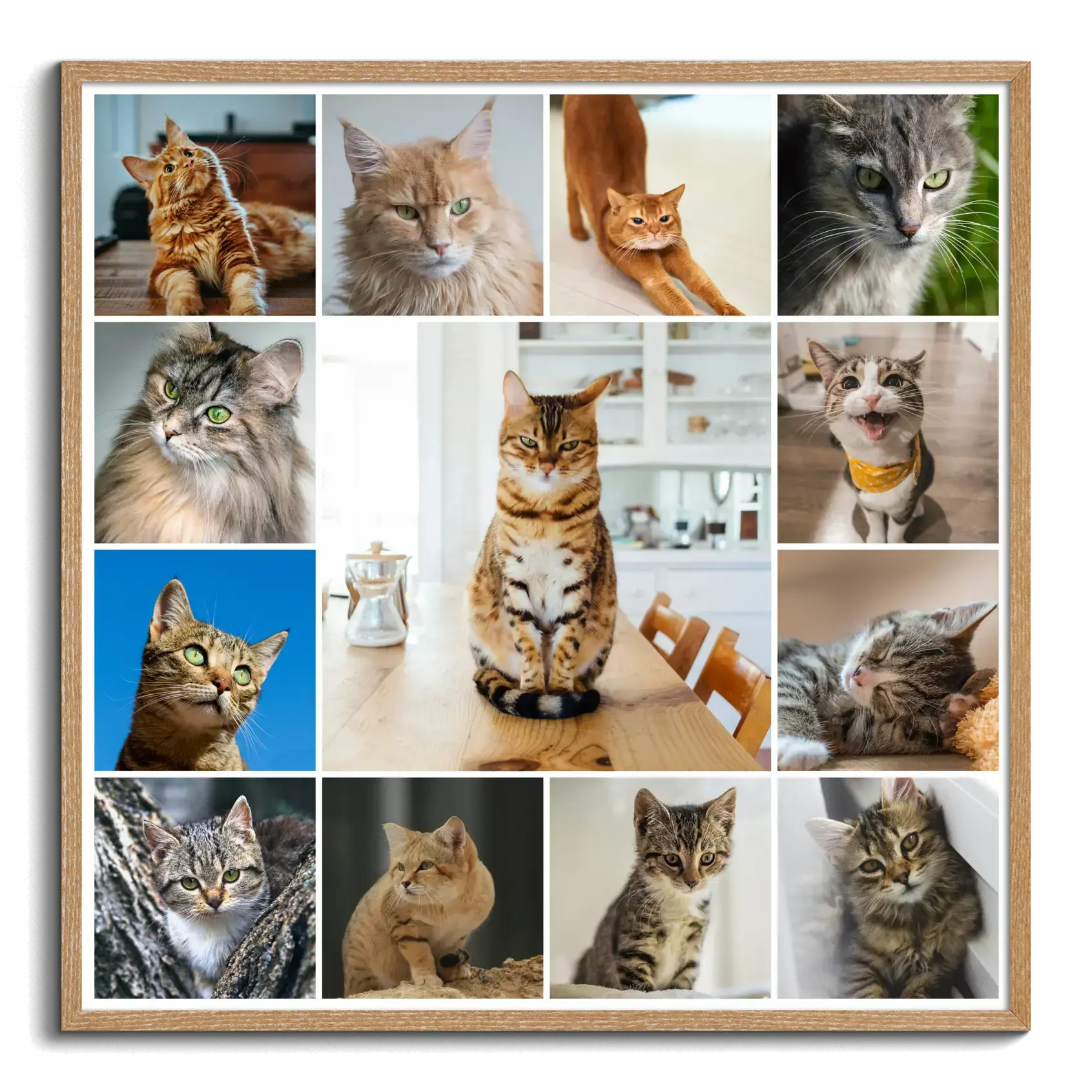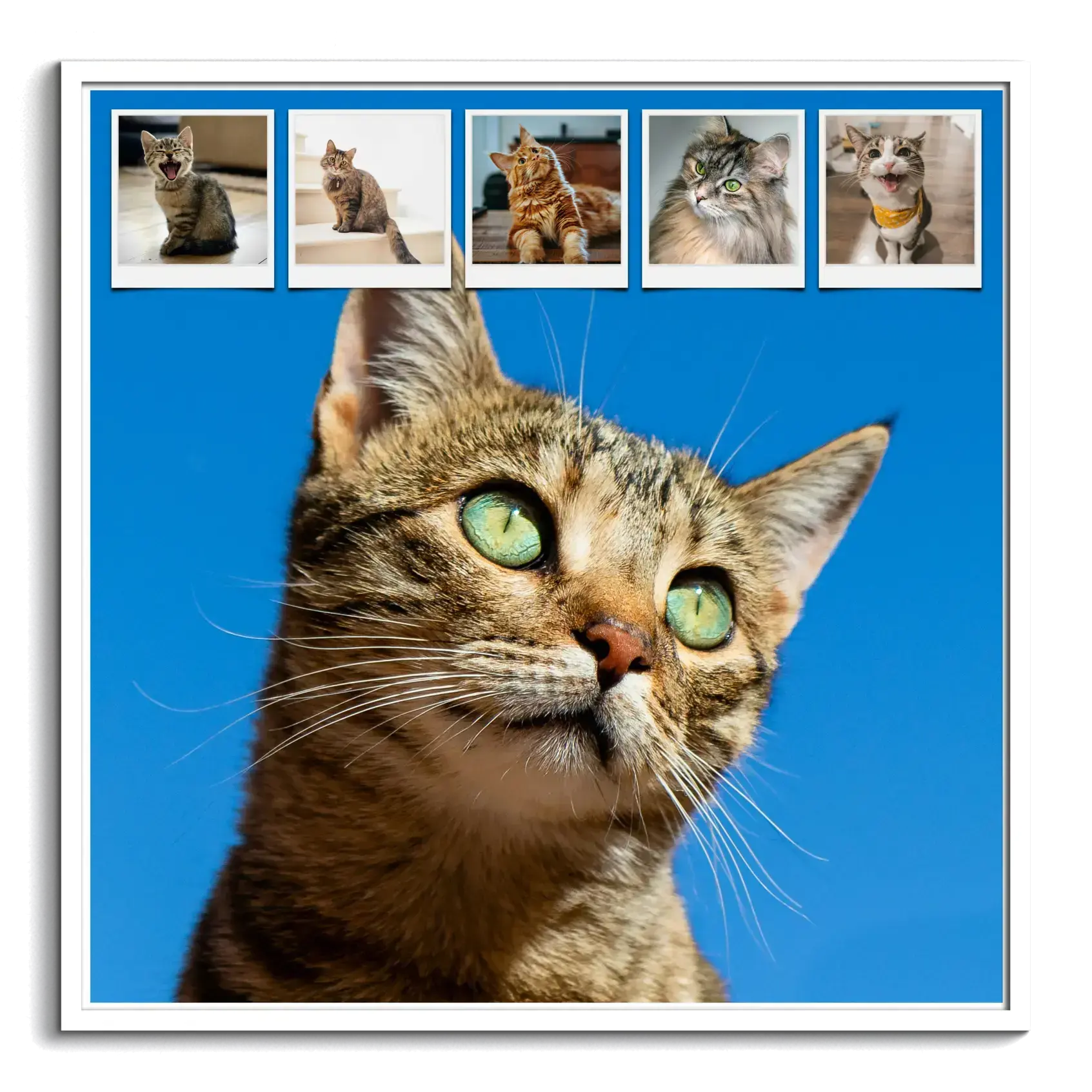 Jetzt gestalten und bestellen: Setze deine Katze perfekt in Szene – vom frechen Schnappschuss bis zum Kuschelmoment. Lade mehrere Bilder hoch und arrangiere sie in Herz-, Raster- oder Textformen. Verleihe dem Motiv eine Überschrift wie Herz auf 4 Pfoten und wähle Größe sowie Material nach Geschmack.