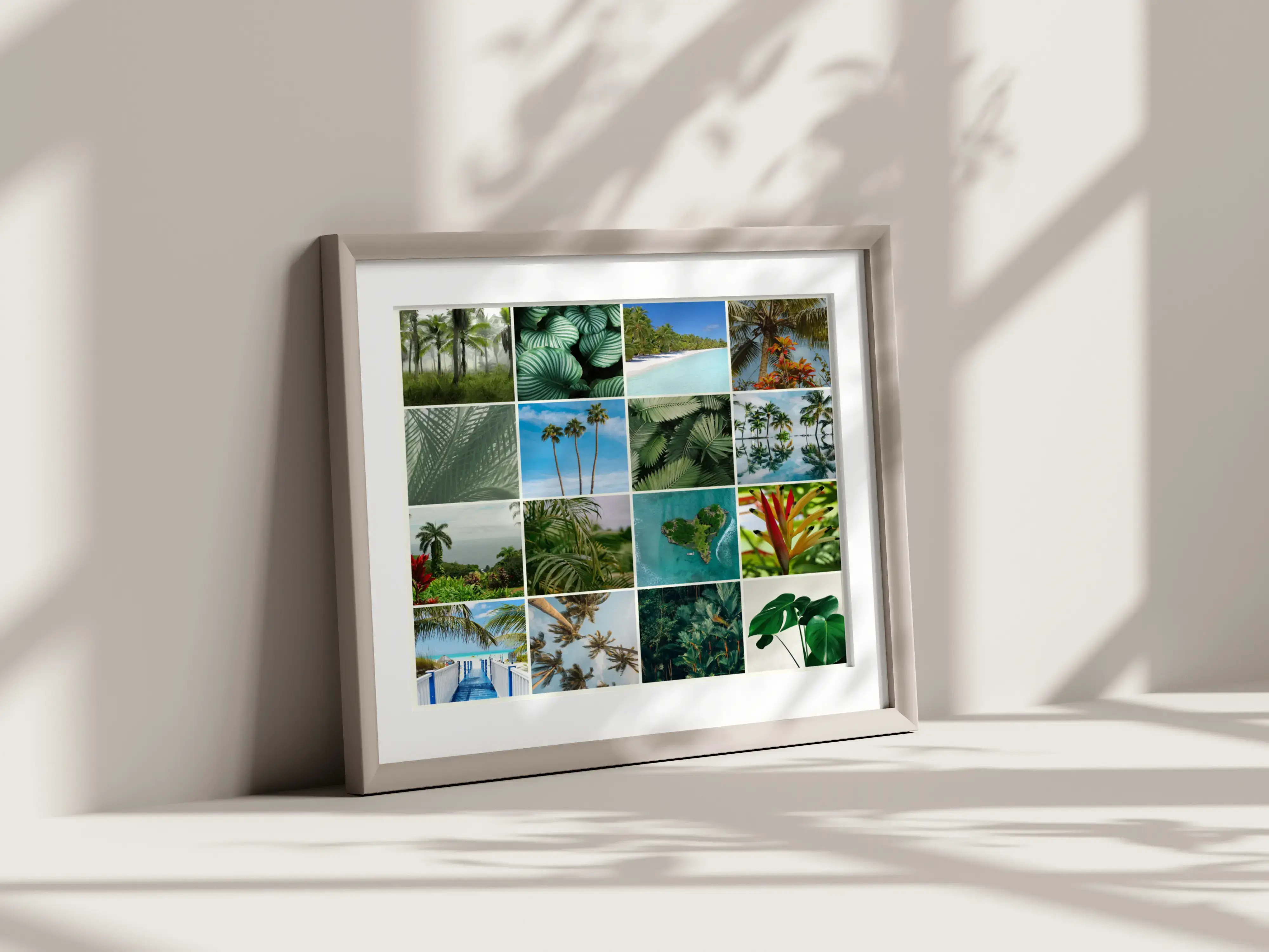 Gestalte jetzt deine Naturfotografie-Collage direkt im Browser. Dieses Beispiel dreht sich um Pflanzen und Blumen: tropische Palmen, sattes Regenwaldgrün und Strandmotive treffen auf leuchtende Blüten und filigrane Blattstrukturen. So holst du frische Tropenstimmung als hochwertigen Premiumdruck an deine Wand.