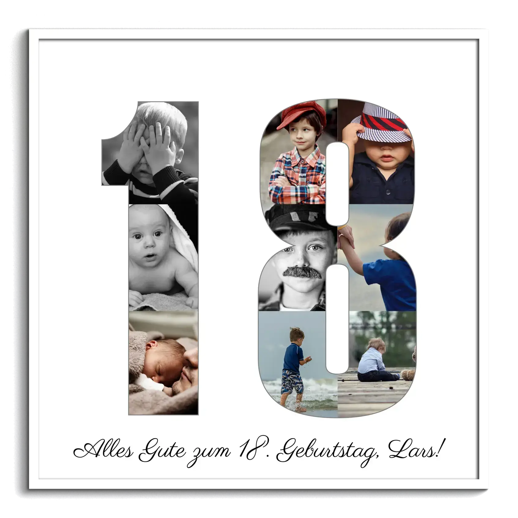 Du suchst nach einem kreativen und persönlichen Geschenk? Entdecke unsere individuell gestaltbare Fotocollage "18", zusammengestellt aus deinen liebsten Memories. Unsere "18"-Fotocollage ist das Highlight auf jedem Geburtstagsfest zur Volljährigkeit. Jede Collage ist so einzigartig wie der Mensch, dem sie gewidmet ist.