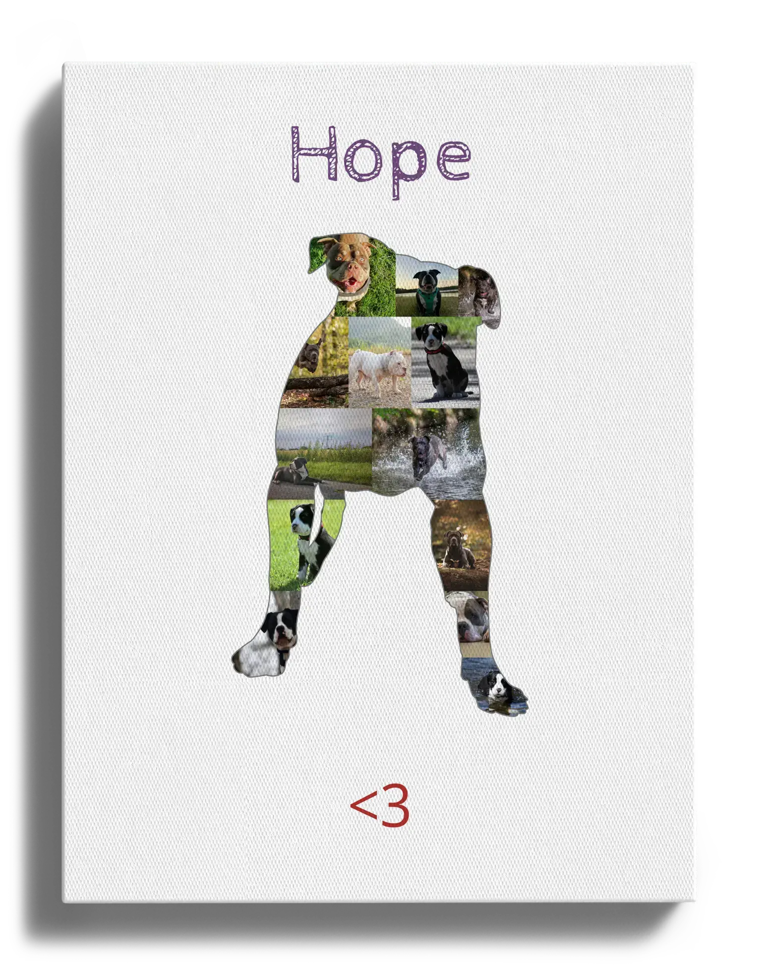Gestalte jetzt dein persönliches Hundeporträt! Präsentiere deine Lieblingsbilder deines American Bully in einer einzigartigen und persönlichen Fotocollage. Dieses Produkt ermöglicht es dir, etwa 15-20 deiner schönsten Fotos kreativ in Form der Silhouette deines Vierbeiners zu arrangieren. Zusätzlich kannst du einen persönlichen Text hinzufügen, um das Bild zu vervollständigen.