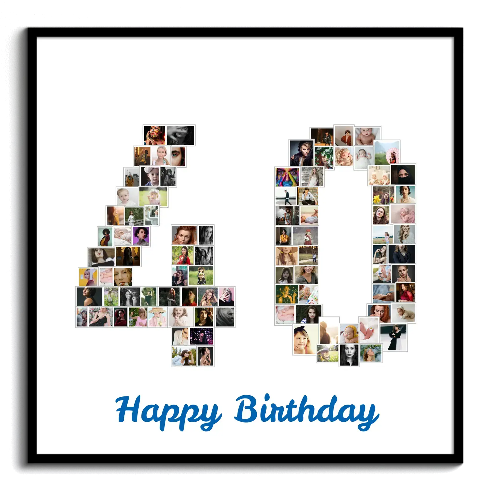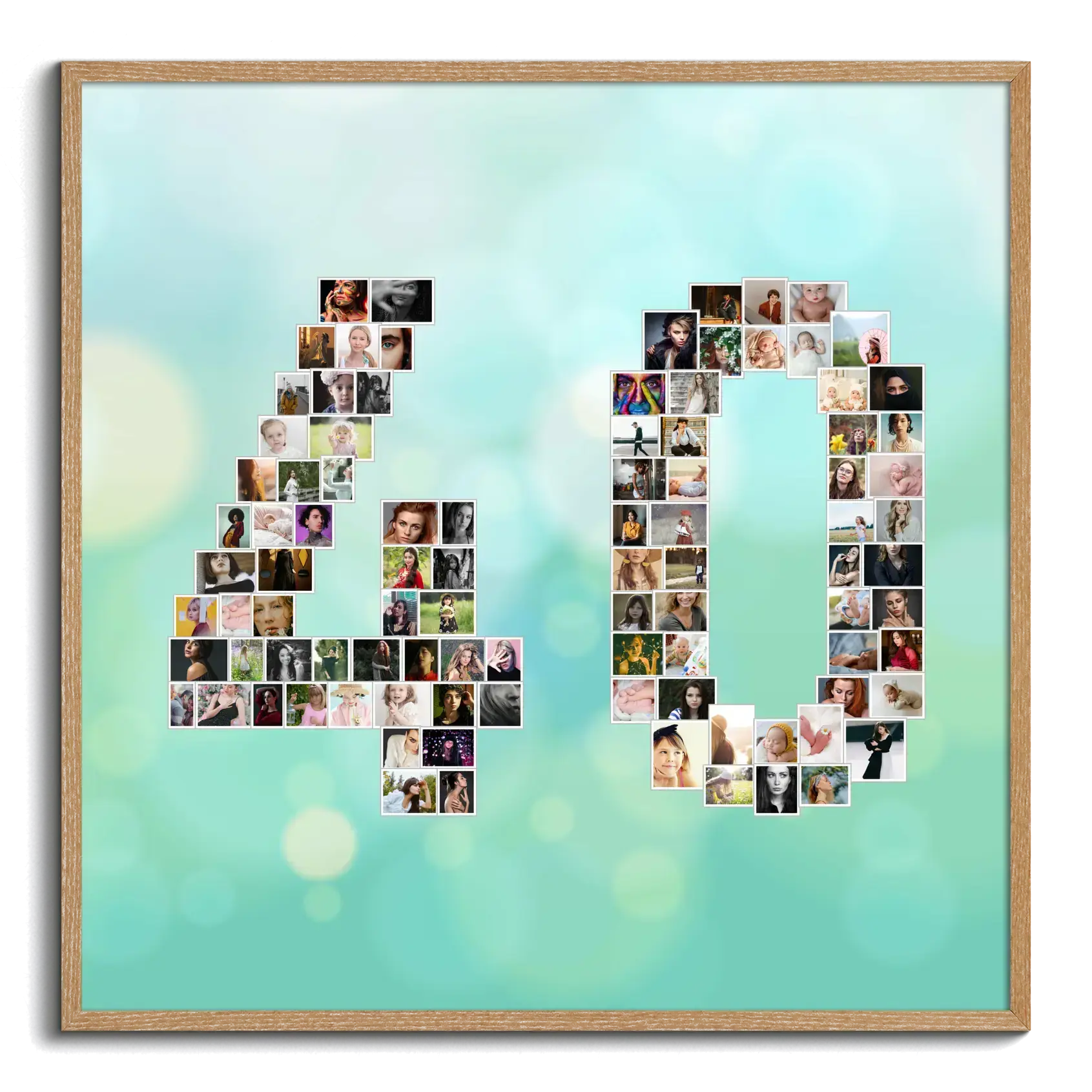 Feiere spezielle Momente mit unserer personalisierten Fotocollage, die die Zahl "40" aus deinen liebsten Fotos darstellt. Mit diesem einzigartigen Design kannst du bis zu 100 Bilder nutzen, um die einprägsame Zahl zu formen, egal ob du einen vierzigsten Geburtstag, ein vierzigjähriges Firmenjubiläum oder einen Hochzeitstag feierst.