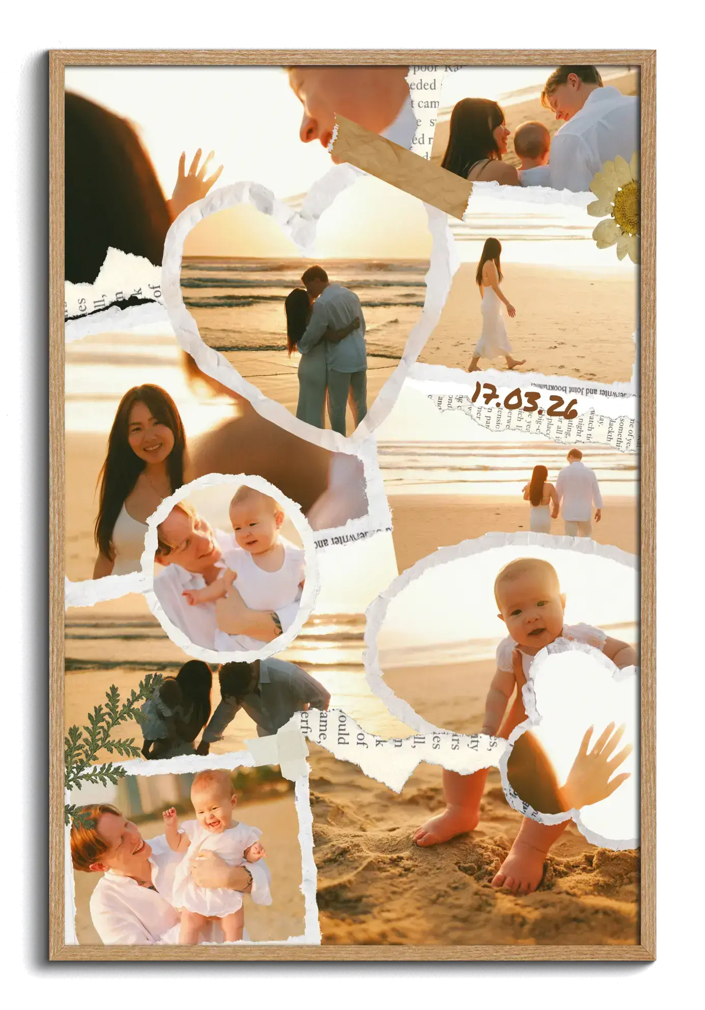 Bei der Gestaltung hast du viele Freiheiten. Du kannst je nach Vorlage mehrere Bilder kombinieren, Texte wie Namen, Datum oder kurze Botschaften einfügen und Farben sowie Details an deinen Stil anpassen. Ob verspielt mit zerrissenen Kanten und dekorativen Elementen oder etwas ruhiger und klarer gestaltet, die Scrapbook-Optik lässt sich individuell auf eure Geschichte und den Anlass abstimmen. Auch Hochformat und Querformat sind möglich.