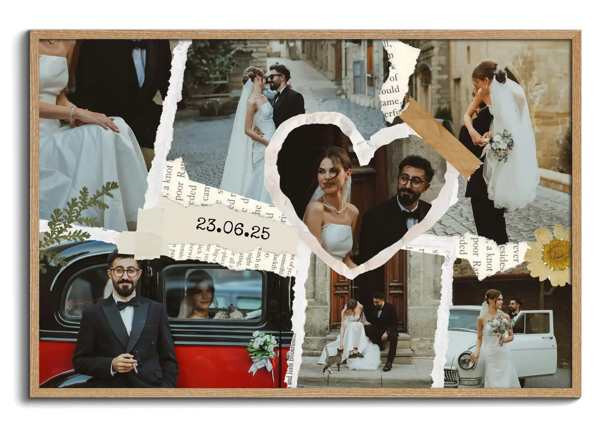 Romantische Hochzeitscollage im Scrapbook-Stil mit Fotos, Tape-Details, Namen und Datum