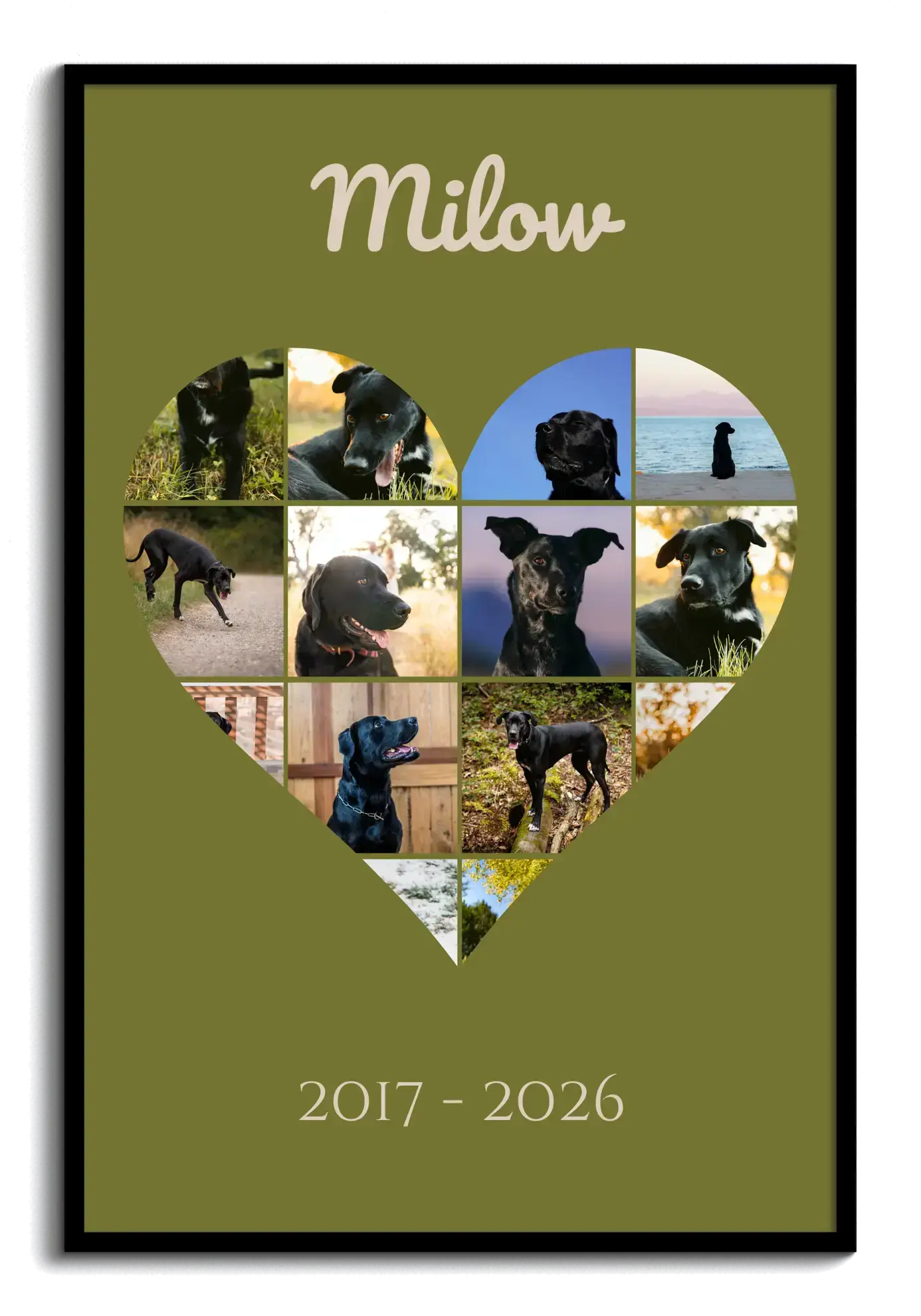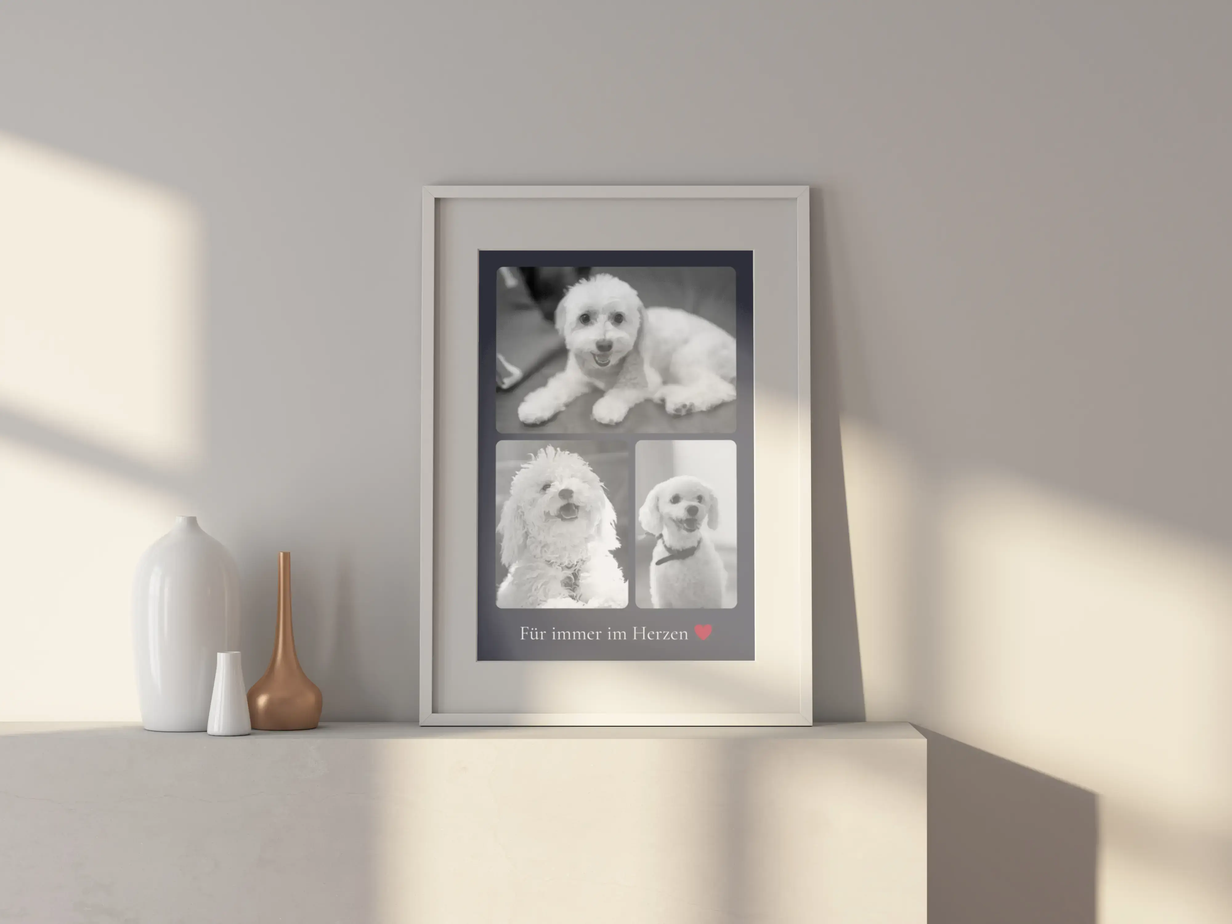 Passe alles an deine Erinnerungen an: flexible Bildanzahl, Layouts von dezentem Raster über Herzformen bis zu Hunde-Silhouetten, Hintergrundfarben oder -strukturen, Ränder und Abstände, Schwarzweiß- oder Farbstil, Polaroid-Optik, frei platzierbare Widmungen, Emojis, Daten und Namen.