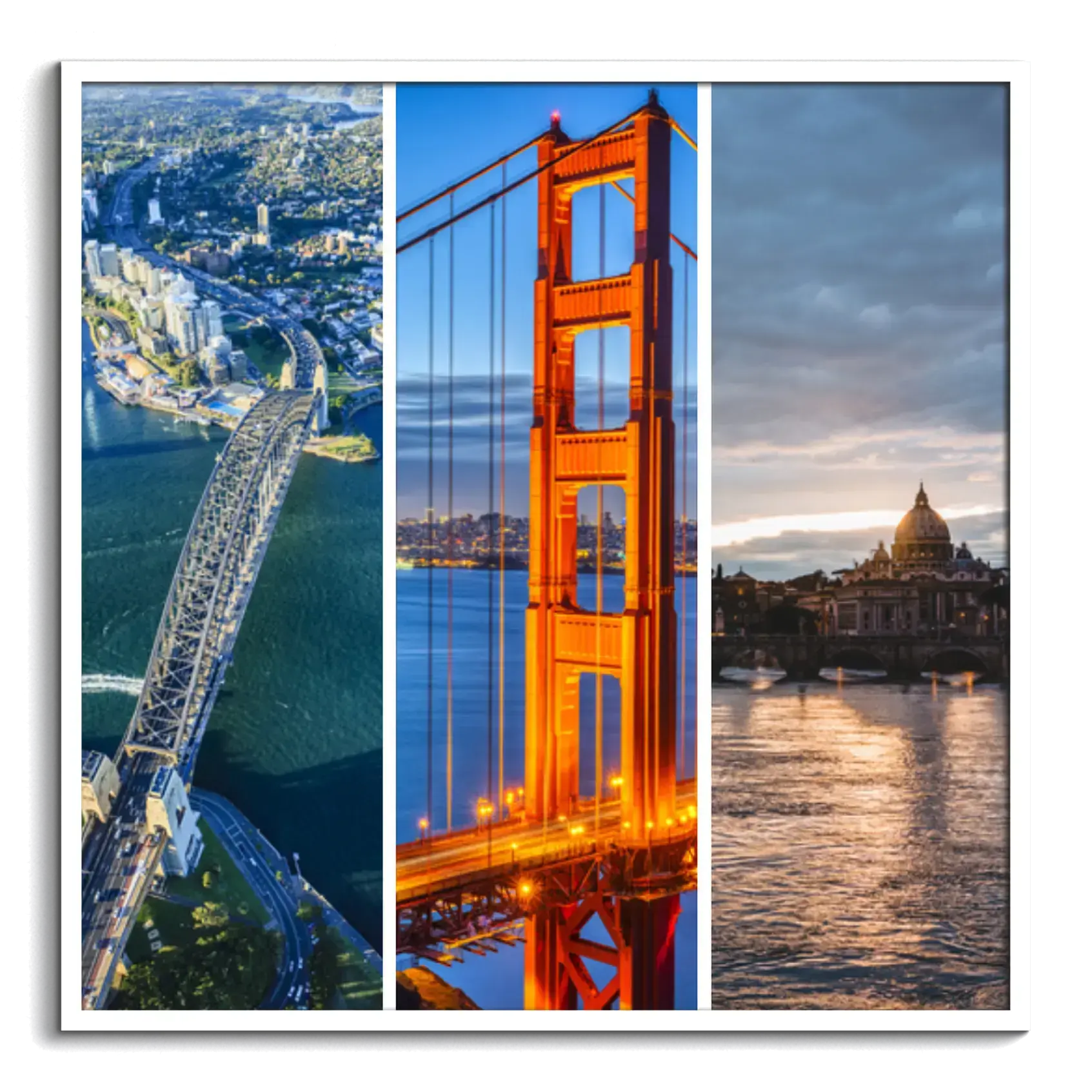 Urlaubsfotos als Wandschmuck: Städte und Sehenswürdigkeiten in Collagen mit Wunschtext.